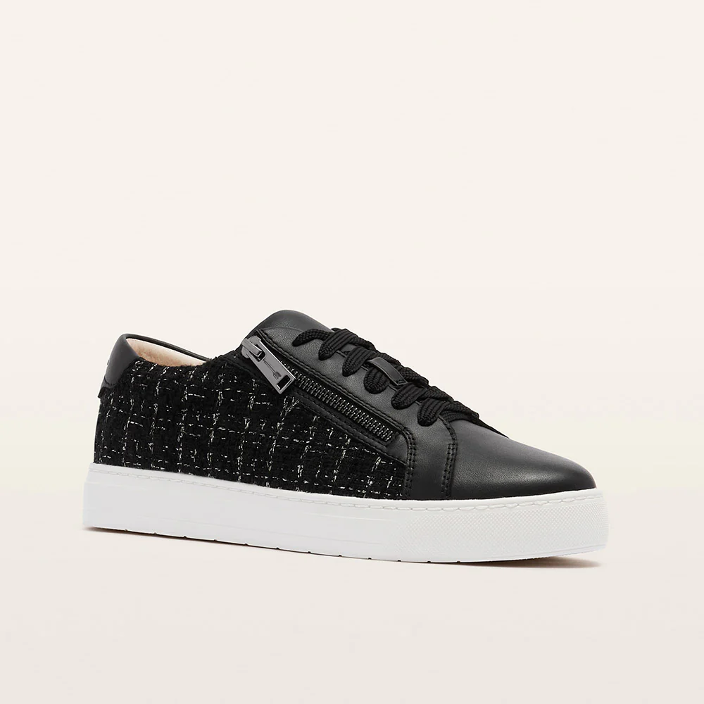 A luxe addition to your sneaker collection, blending heritage-inspired finishes: Billie in chic Black Tweed. Billie’s sleek leather silhouette features a side zip for easy wear, expertly placed foam lining, butter-soft leather, and a four-layered cushion and support system. Elevating a mainstay sneaker style with luxe finishes and forward-thinking design, Billie is more than meets the eye.Â