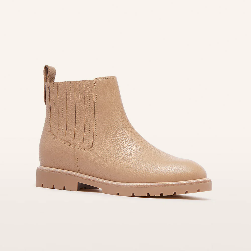 Sage in Camel Tumbled blends style and function in the ultimate boot. A pebbled leather upper adds texture and practicality with a water-resistant finish. Custom fit options, multi-layer cushioning, and arch support keep you comfortable all day. Featuring a utility-inspired sole and side zip, Sage also has leather-covered elastic gussets for a snug, secure fit.