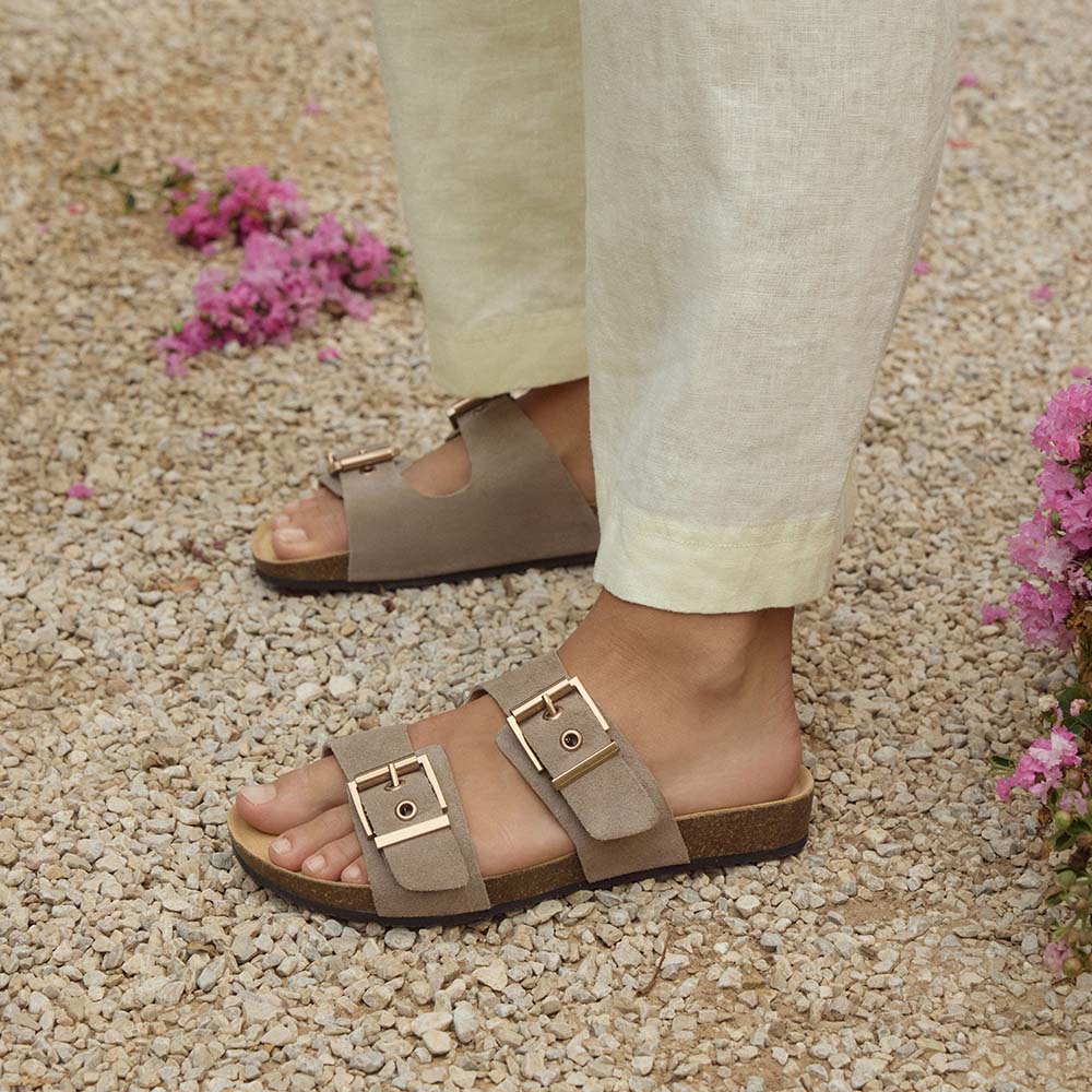Slip into effortless comfort and style with Tommy in luxe Mushroom Suede. Designed with adjustable straps and updated hardware, Tommy is grounded in our podiatrist-designed Sole Hero® Footbed to support the heel, arch, and forefoot. This essential slide also features soles moulded with rice husk—an upcycled agricultural byproduct—offering lightweight support with considered detail.